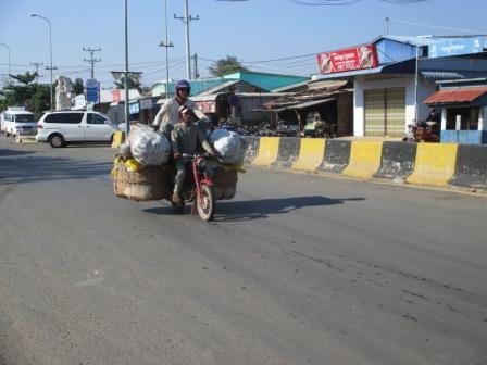 Dans les transports en commun au Cambodge, il y a les bus, les tuktuk, ca on connait, les tuktuk tirés par des tracteurs ca c’est plus grave mais dans la campagne, j’ai déjà vu sur une moto 5 personnes (le père, la mère et entre en sandwich 3 petits enfants).