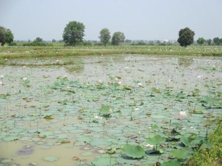 Apres notre déjeuner dans la salle qui fait classe aussi, nous allons dans les champs derrière la maison pour découvrir des champs de lotus (ou nénuphar), très belle fleur rose qui fait