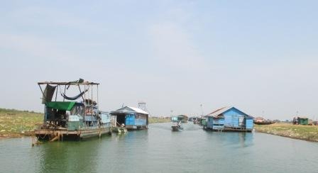 L’après midi (environ 35 degrés) presque en plein soleil, balade dans toute petite pirogue sur le tonlé Sap pour découvrir un village flottant de pécheurs : Kampong Chnang est un important port de pêche sur le Tonlé Sap , On y pratique la pisciculture. Les pécheurs vivent sur des maisons flottantes avec oui oui des toilettes , en fonction de la saison et du niveau du fleuve, ils tractent leur maison ou bon leur semble et surtout ou est le poisson.